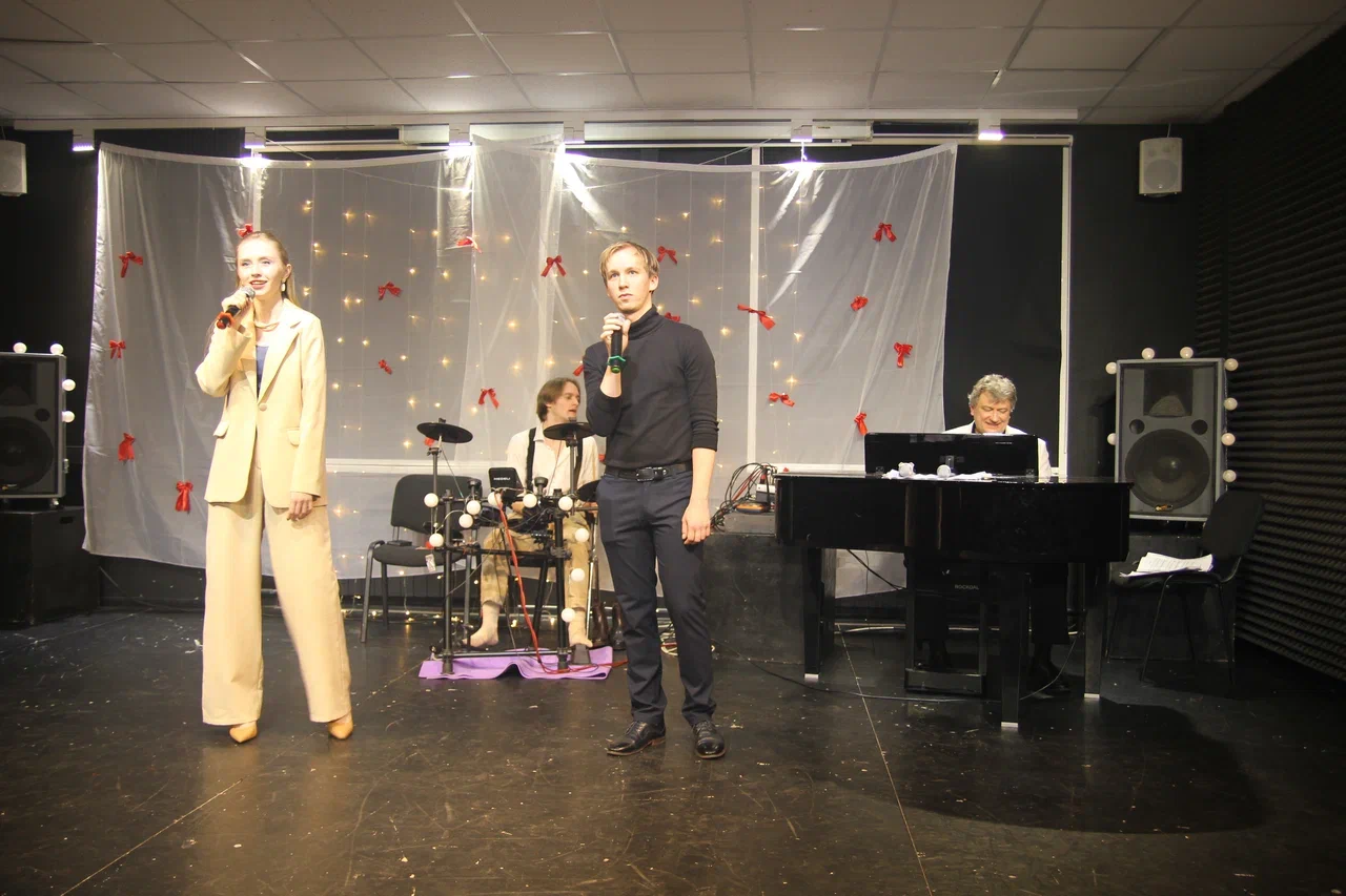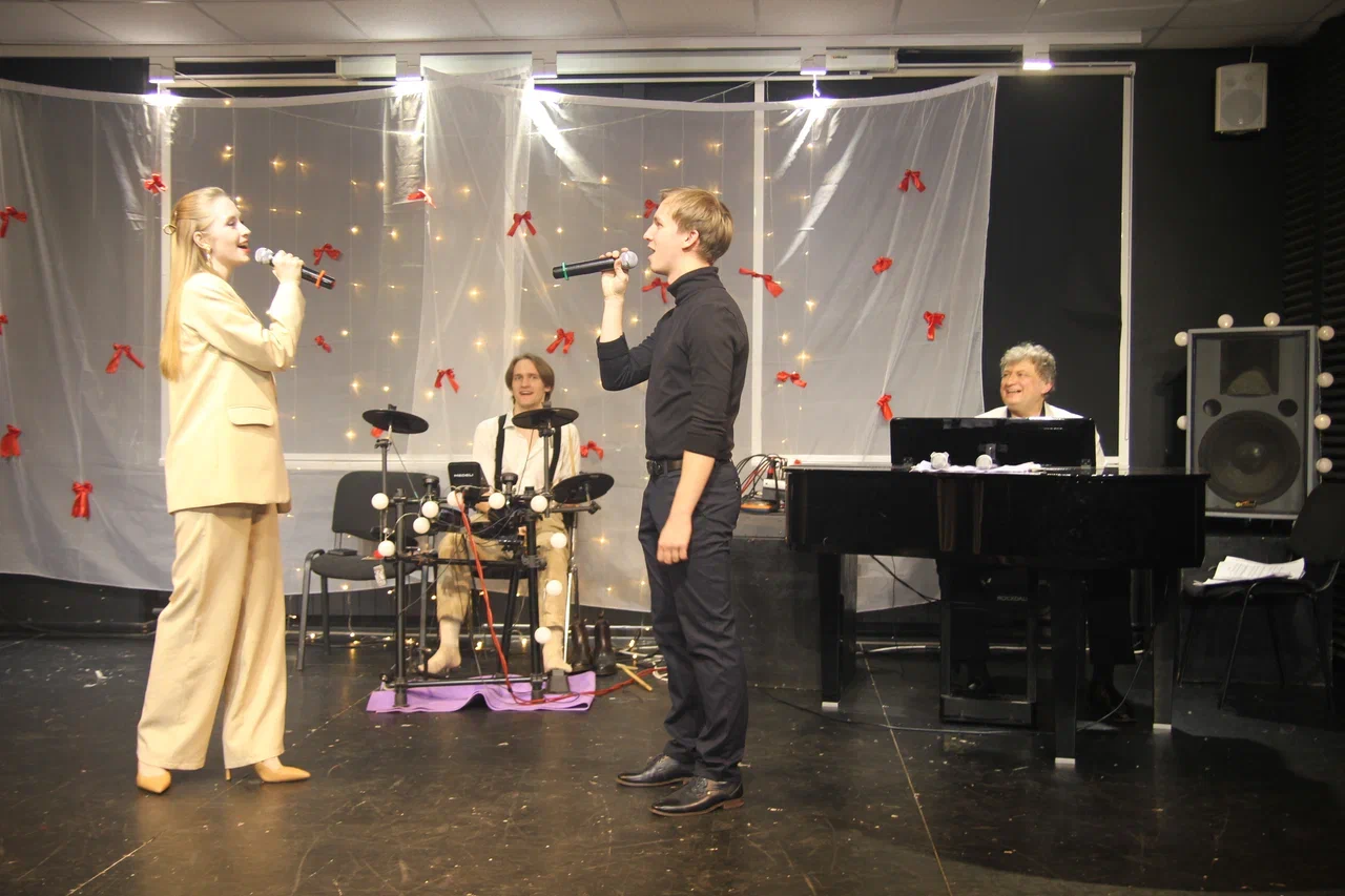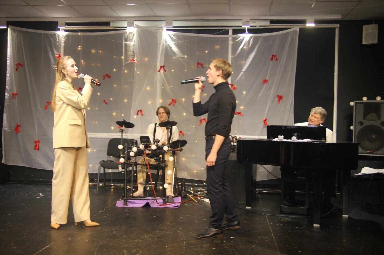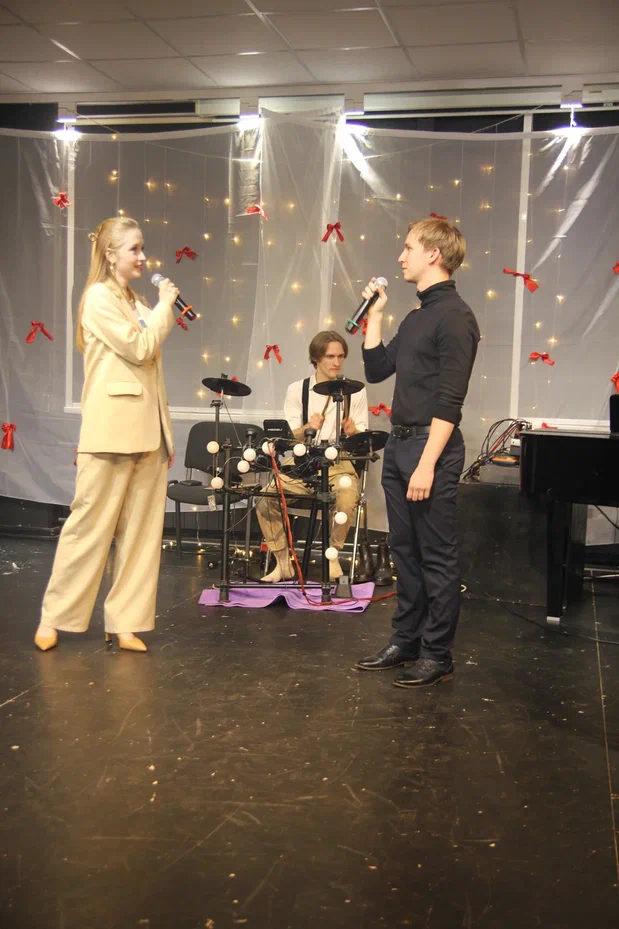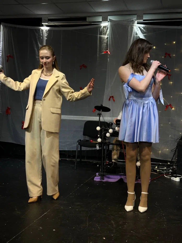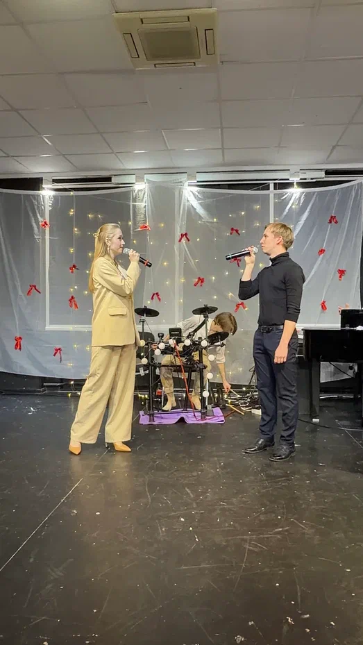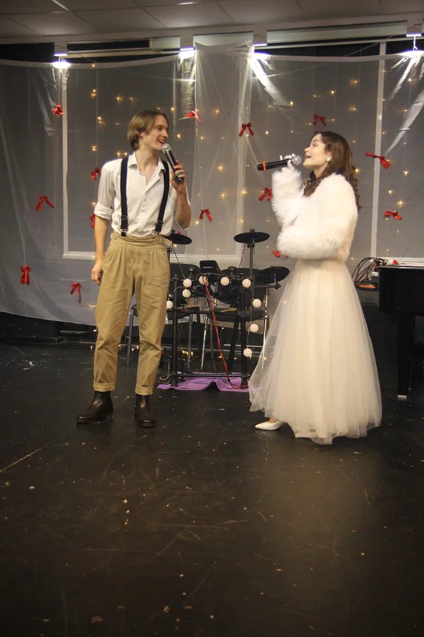 Фотографии дуэта в исполнении песни “Зима в сердце” (Гостья из будущего) на экзамене по вокалу. Работа не только на сцене, но и в подготовке и постановке номера.