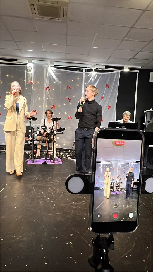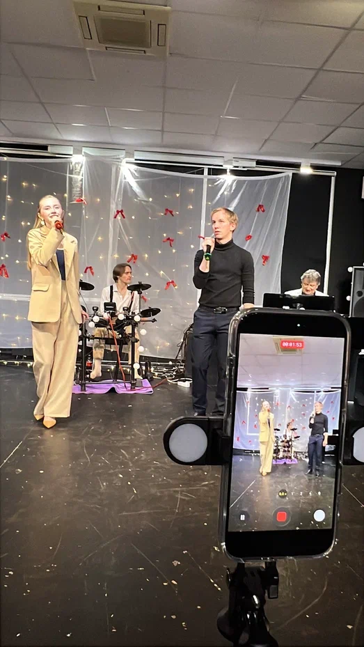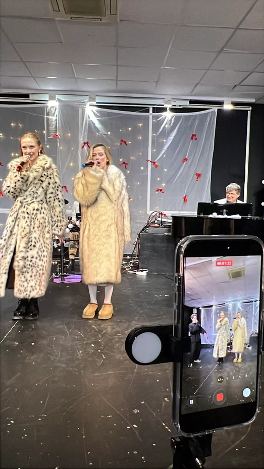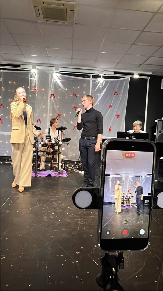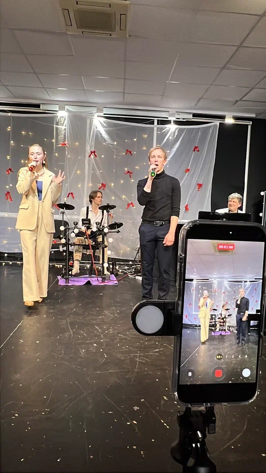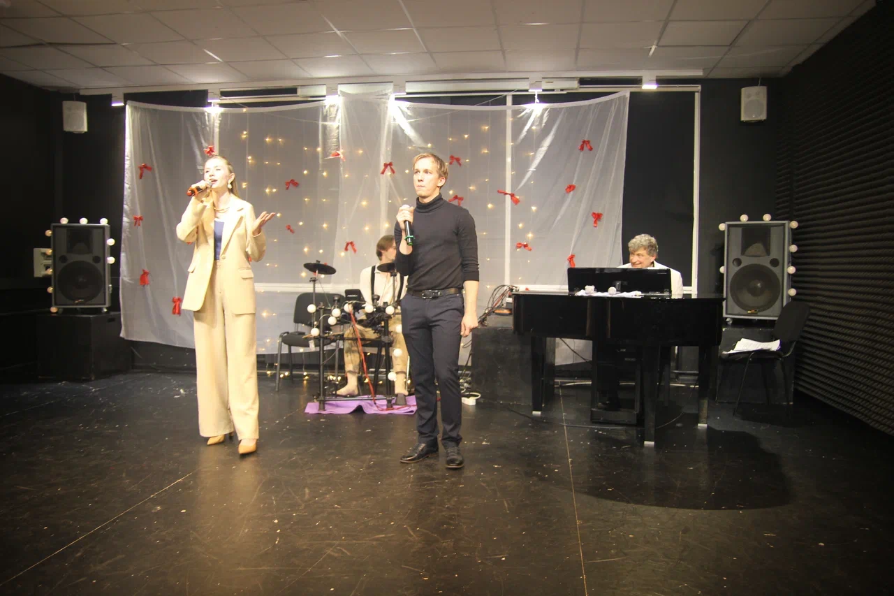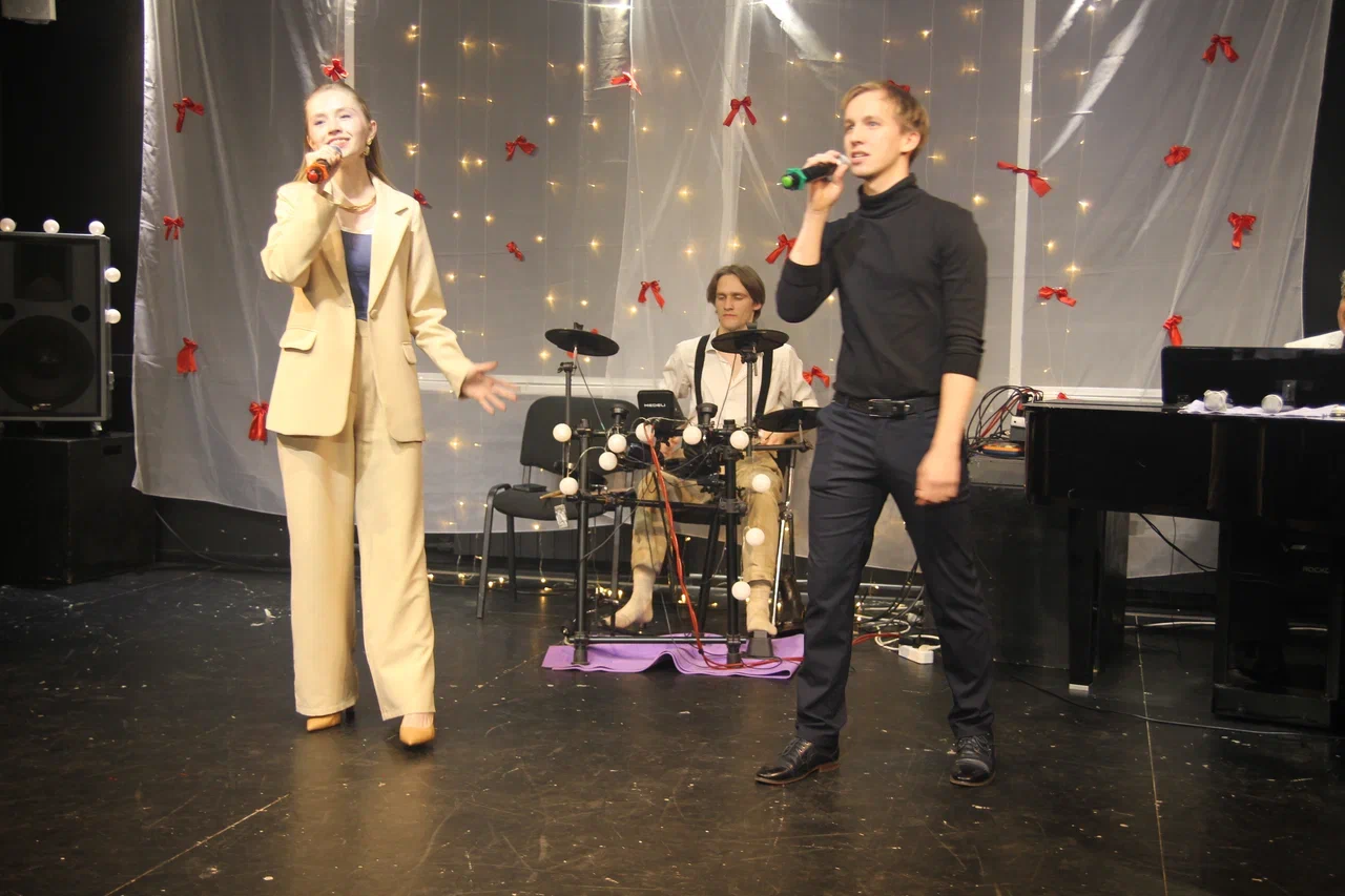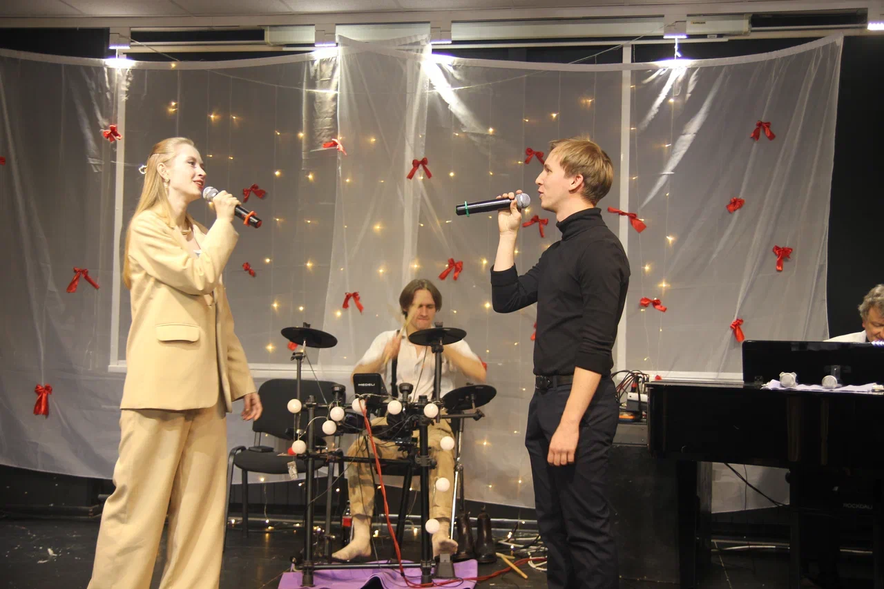 Фотографии дуэта в исполнении песни “Зима в сердце” (Гостья из будущего) на экзамене по вокалу. Работа не только на сцене, но и в подготовке и постановке номера.
