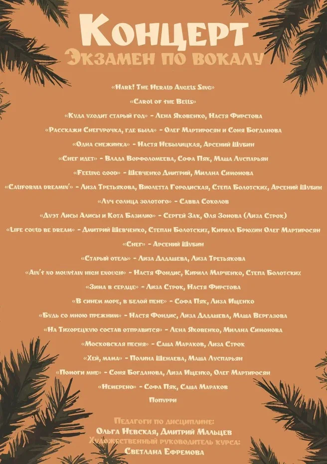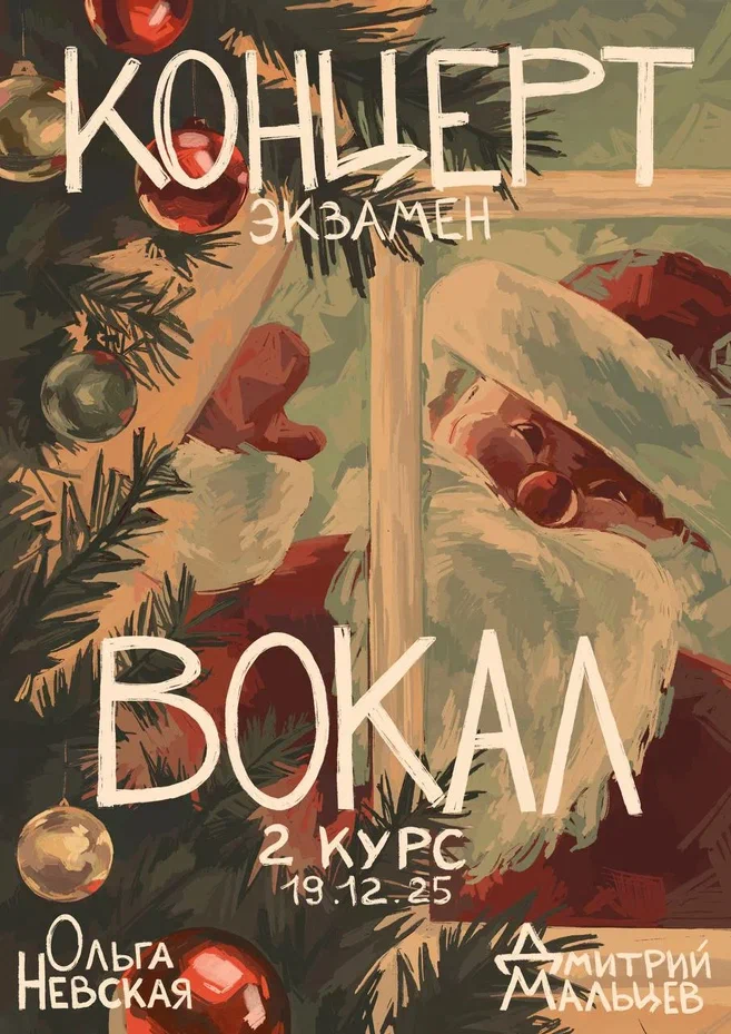 В декабре 2025 г. после окончания первого полугодия 2-го курса мы сдавали несколько экзаменов, из которых открытыми показами стали два: вокал и актерское мастерство.
